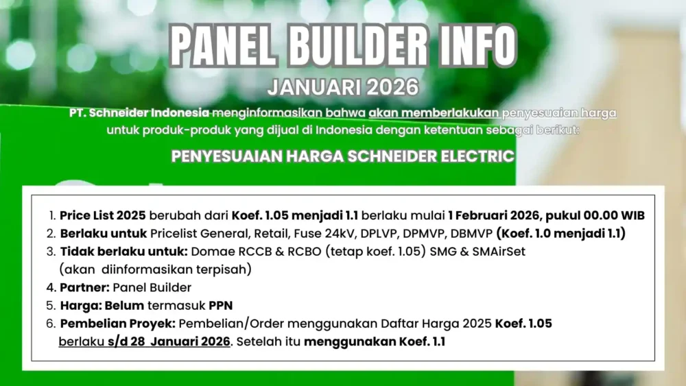 Schneider Electric Indonesia menginformasikan adanya penyesuaian harga produk yang akan mulai berlaku efektif pada 1 Februari 2026. Kebijakan ini ditujukan khusus bagi mitra Panel Builder, sebagai respons terhadap dinamika biaya global dan kondisi ekonomi terkini. Penyesuaian harga ini dilakukan dengan mempertimbangkan beberapa faktor utama, antara lain: Kondisi tersebut berdampak langsung pada biaya produksi dan pengadaan material. Oleh karena itu, […]