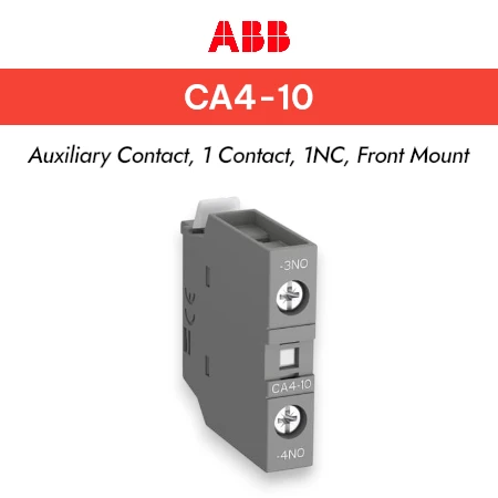 CA4-10 is a 1-pole front mounted auxiliary contact block equipped with screw terminals and can be fitted on AF(C)09(Z)(B)…96 contactors and NF(C)(Z)(B) contactor relays. CA4-10 is available with 1 N.O. instantaneous contacts for standard industrial environments.