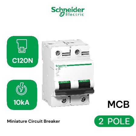 This Acti9 C120N is a low voltage multistandard miniature circuit breaker (MCB). It is a 2P circuit breaker with 2 protected poles, 80A rated current and C tripping curve. The rated short circuit breaking capacity goes up to 10000A at 230VAC to 400VAC conforming to EN/IEC 60898-1 standard and 10000A at 230VAC to 400VAC conforming to EN/IEC 60898-1 standard. It complies with both industrial standard EN/IEC 60898-1 and residential standard EN/IEC 60947-2. This miniature circuit breaker combines functions of circuit protection against short circuit and overload current, control and isolation. The presence of green strip guarantees contact open physically and allows work to be carried out safely on the downstream circuit. It has good overvoltage withstand capacity. The product is designed to offer a high industrial performance level It has an electrical endurance going up to 5000 cycles and a mechanical endurance going up to 20000 cycles. The Ue operational voltage is going from 380VAC to 415VAC. The Ui rated insulation voltage is 500VAC. Its limitation class 3 (according to EN/IEC60898-1) improves downstream circuit protection cost. The product can be clipped on a DIN rail. Its width is 6 pitches of 9mm. Pollution degree is 3. Overvoltage category is IV. The product colour is white (RAL9003). The dimensions are (W) 54mm x (H) 81mm x (D) 73mm. The weight is 0.41kg. It has an IP20 degree of protection (as per IEC/EN 60529) on its terminals. The operating temperature is -25°C to 70°C. The storage temperature is -40°C to 85°C.
