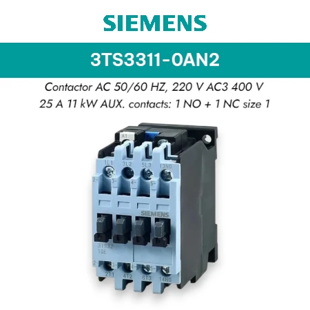 Siemens Contactor 3TS3 AC 50/60 HZ, 220V AC3 400V 25A 11KW, 1NO+1NC size 1